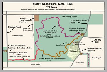 Andy's Wildlife Park encompasses 170 acres of wetlands, tidal estuary and a forest. Nearly all of the park lies south of Sandberg Road and West of Eckenstam-Johnson Road.