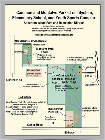 Jane Cammon Park is 40 acres in size and includes the the Jane Cammon Walking and Bicycle Trail, Anderson Island Elementary School, and the adjoining youth sports complex.