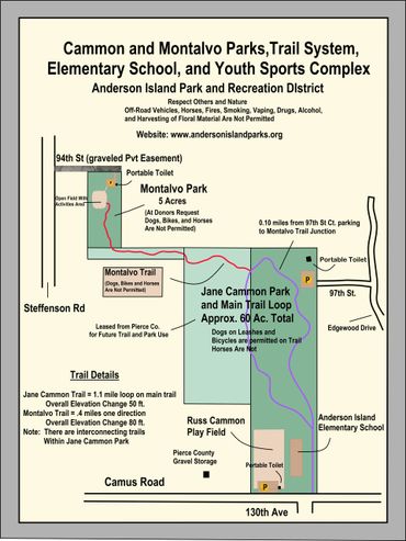 A trail connects Montalvo Park and the Jane Cammon Trail for extended hiking opportunities. Winding through woods and a lightly wooded glen with salal, huckleberries, and other native bushes, this connecting trail offers the chance to hear and see many woodland birds, including pileated woodpeckers, pacific wrens, song sparrows and more.